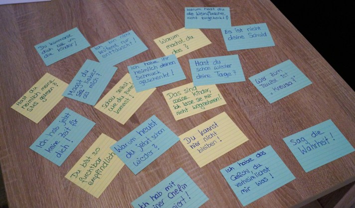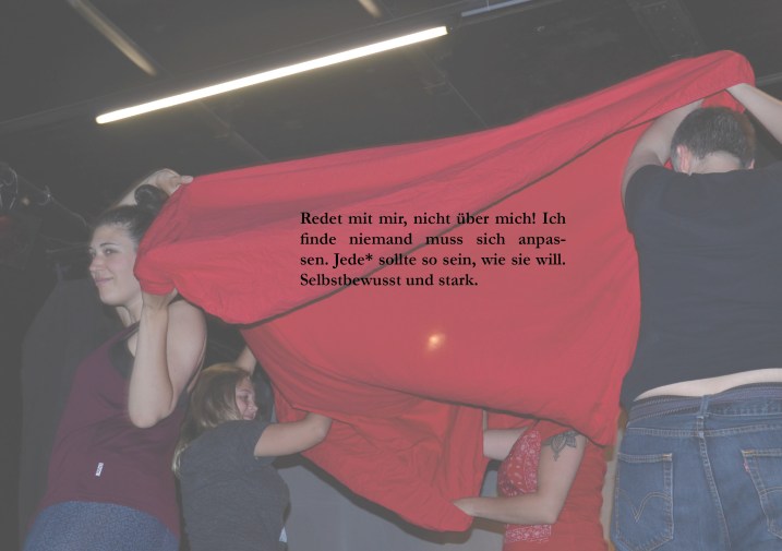 Aus diesen Themenkomplexen haben die Teilnehmenden diesen Projekts eine Szenencollage entwickelt, die nicht eins zu eins den Medea-Stoff, sondern die persönlichen Auseinandersetzungen und Assoziationsräume wiedergibt. Gearbeitet haben wir mit Improvisation, auto_biografischen Methoden und Schreibübungen. So wurde zum Beispiel der gesamte Bühnentext von den Teilnehmenden selbst verfasst.